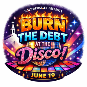 On June 19, 2026, join us for the world’s first “Episco-Disco”!  Your ticket and auction purchases go to pay off our building mortgage and pipe organ restoration so that Holy Apostles can be DEBT FREE!