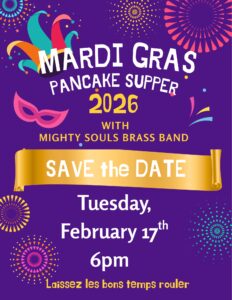 Come celebrate Mardi Gras with the Mighty Soul Brass Band, pancakes, and the Holy Apostles’ family! We can’t wait to see you and laissez les bon temp roulez!